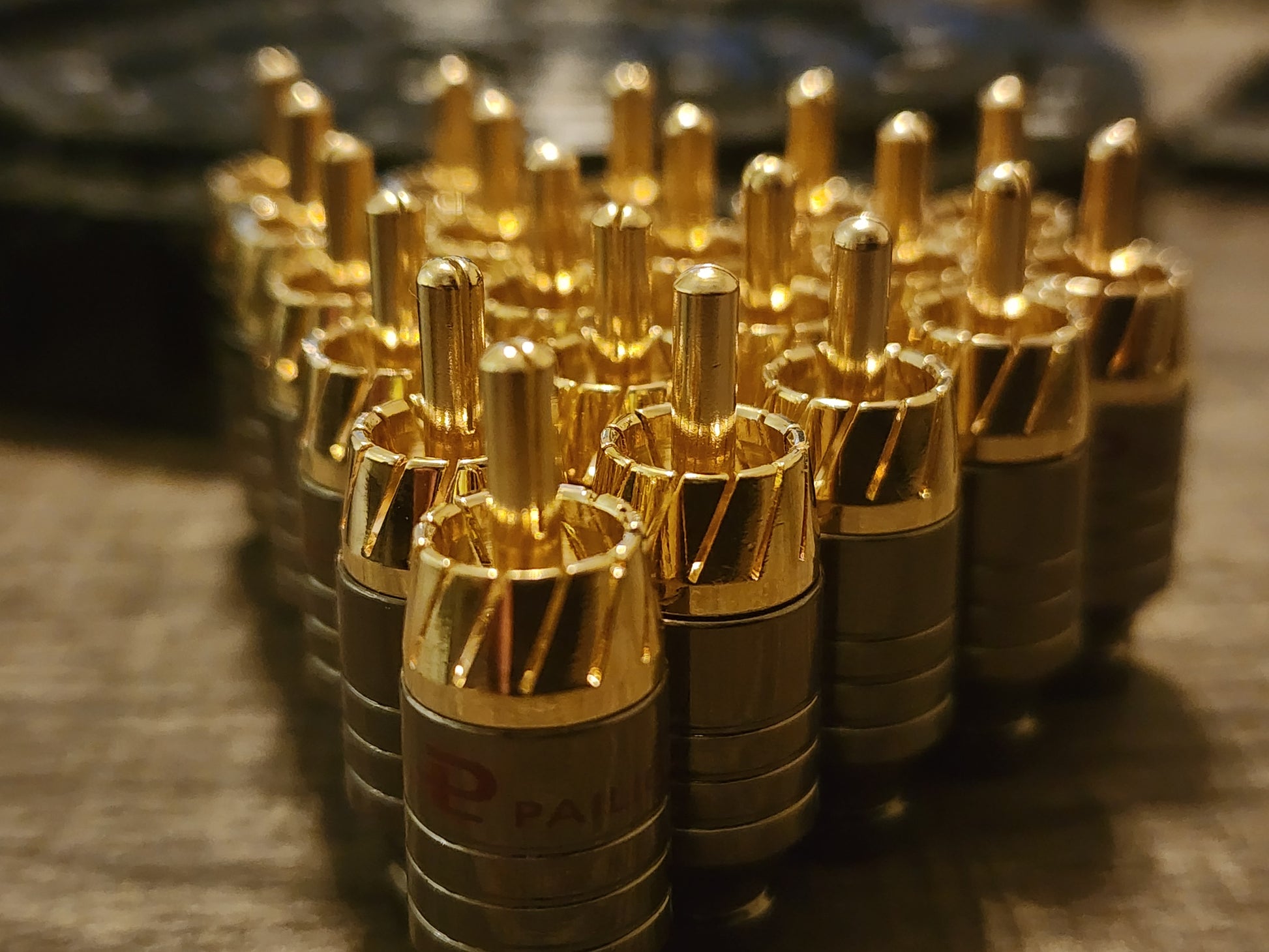 High quality gold plated male RCA terminals. Phenomenal clamping force on the outer barrel helps keep them in place. Very sturdy and good weight on them. Will fit with dual 18g wire with techflex under the screw on back half.
