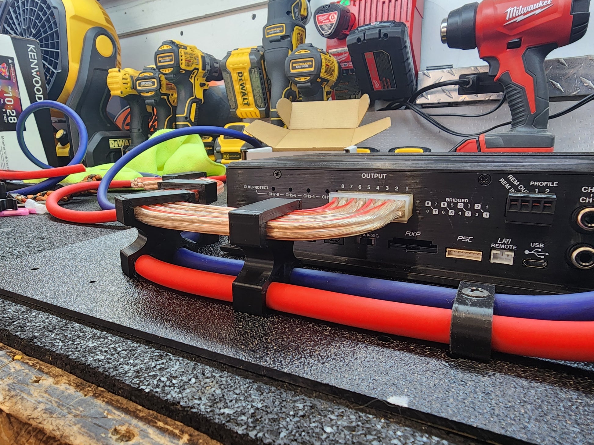 These clamps are designed to be used with the Arc Audio Blackbird amplifier. Will clamp your power wire down and bridge the speaker outputs at the same height as the plug to prevent fatigue on the connector. Comes in only 4g power and ground.